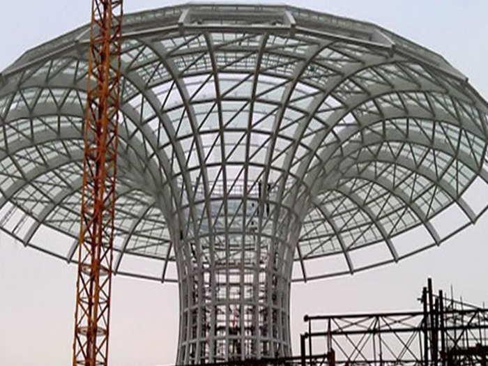 二、球形网架结构因其结构新颖,受力合理,自重轻、用钢量低等优点。如大型体育场馆球形和平螺栓球网架、公共场馆球形网架、电厂和平螺栓球网架、水泥工业球形网架、仓储物流球形网架、和平干煤棚工业球形网架、和平收费站和平加油站球形网架、展览中心、影剧院、商场、航站楼、候车厅、工厂和平车间、仓库、电视塔等球形螺栓球节点网架。国内球形网架结构主要分为:和平焊接球节点网架及螺栓球节点网架两种。螺栓球节点网架其构件工厂内加工量较大,现场安装便捷,适用于现场工期紧,和平施工条件、用电量受制约,网架形状复杂、和平杆件定位困难的异形结构。螺栓球节点球形网架系统基本由和平杆件、螺栓球、支撑支座等组成。按照节点形式可分为交叉和平桁架体系、四角锥体系、三角锥体系等。支撑方式多为固定支座支撑。对于大面积、大跨度及有特殊受力或伸缩要求的网架结构可采用橡胶支座、滑移支座、球铰支座等支撑形式,以满足结构自身的受力稳定、均衡,便于内力释放等设计要求。